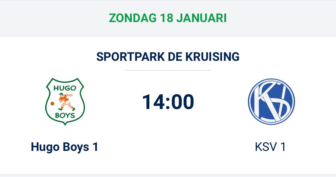 Dinsdag 13 januari 2026Wedstrijd Hugo Boys 1 – KSV 1 is aankomende zondag om 14:00. Let op: de wedstrijd wordt niet bij Hugo Boys gespeeld, maar bij KSV, op Sportpark De Kruising!